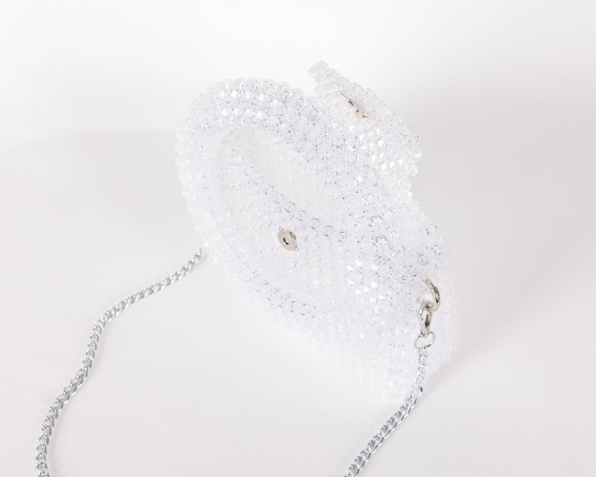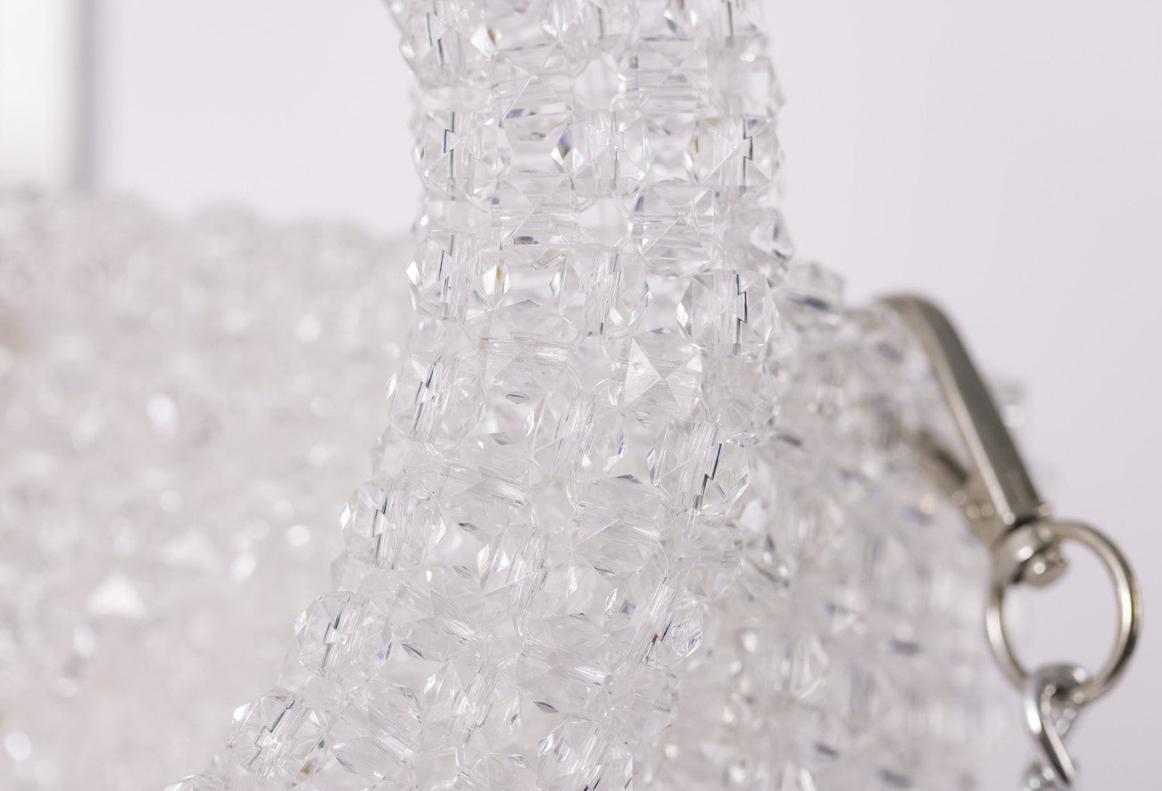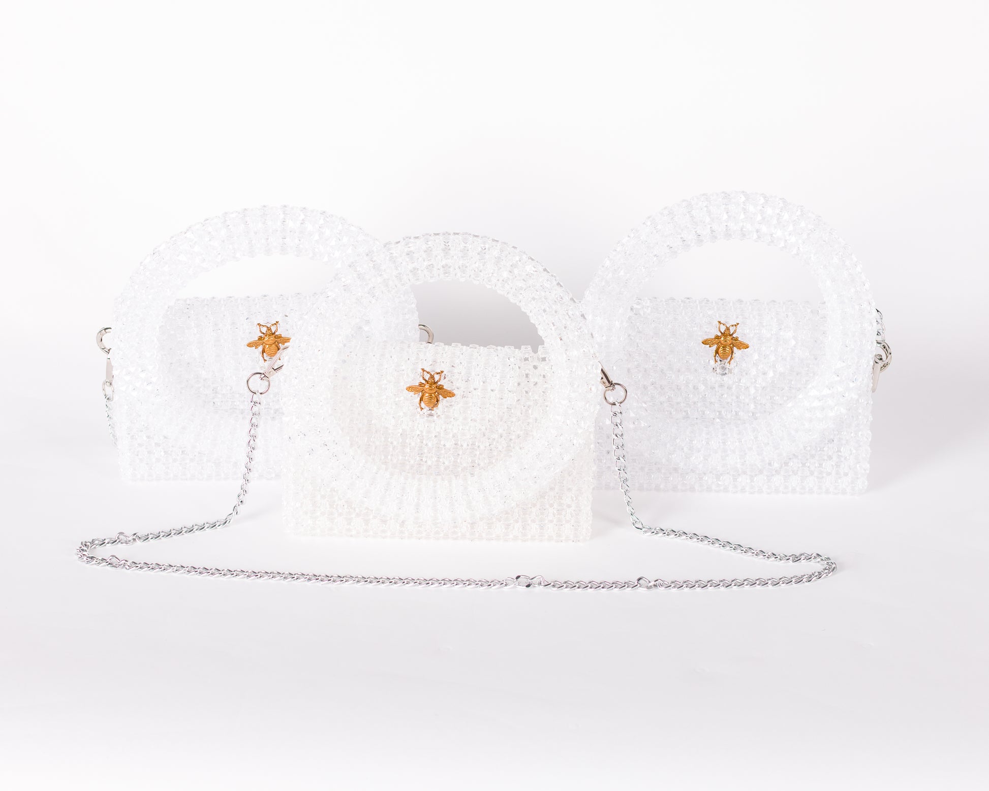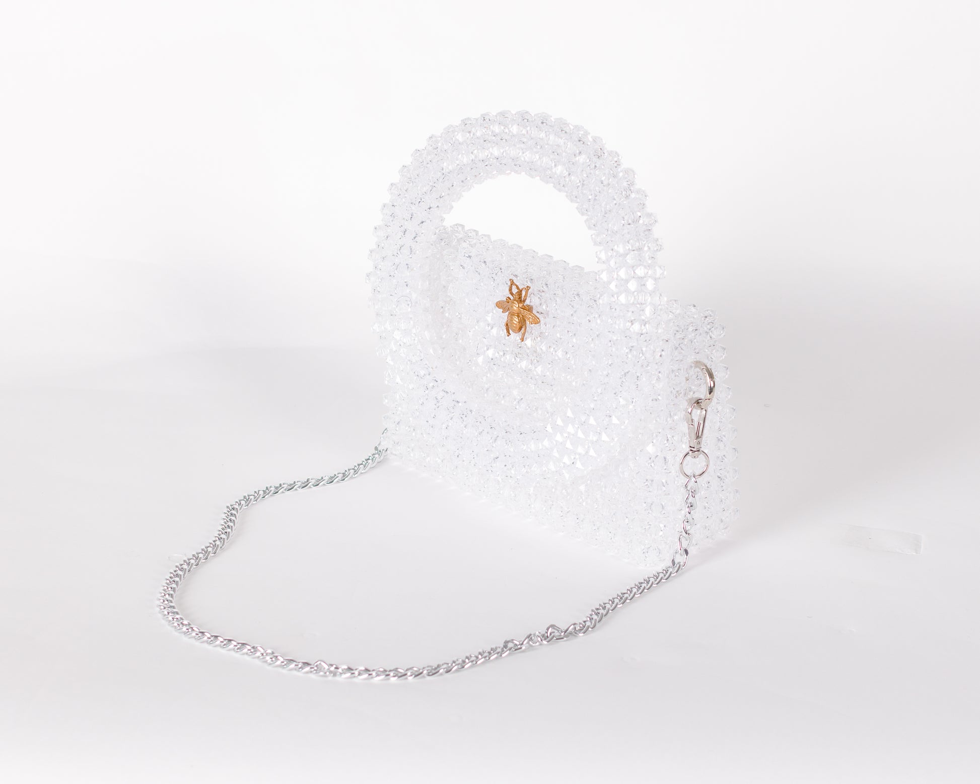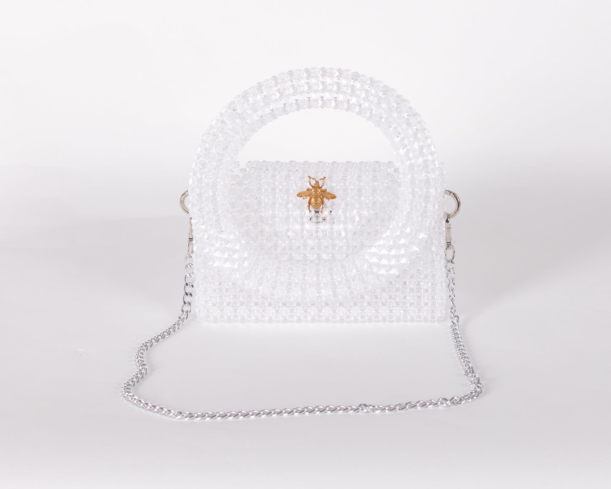 Say hello to Aseda, the radiant showstopper that pairs elegance with personality. Handmade with clear, multifaceted crystal-cut acrylic beads, this structured beauty features a stunning round handle and a sleek beaded flap secured by a magnetic clasp. The signature gold bee emblem adds a charming finish to the front flap, making Aseda a symbol of both beauty and grace. This versatile bag is lightweight yet durable, ideal for both daytime glam and evening sparkle. Its see-through crystal aesthetic reflects light beautifully, making it the perfect companion for minimalist luxury or high-impact style.