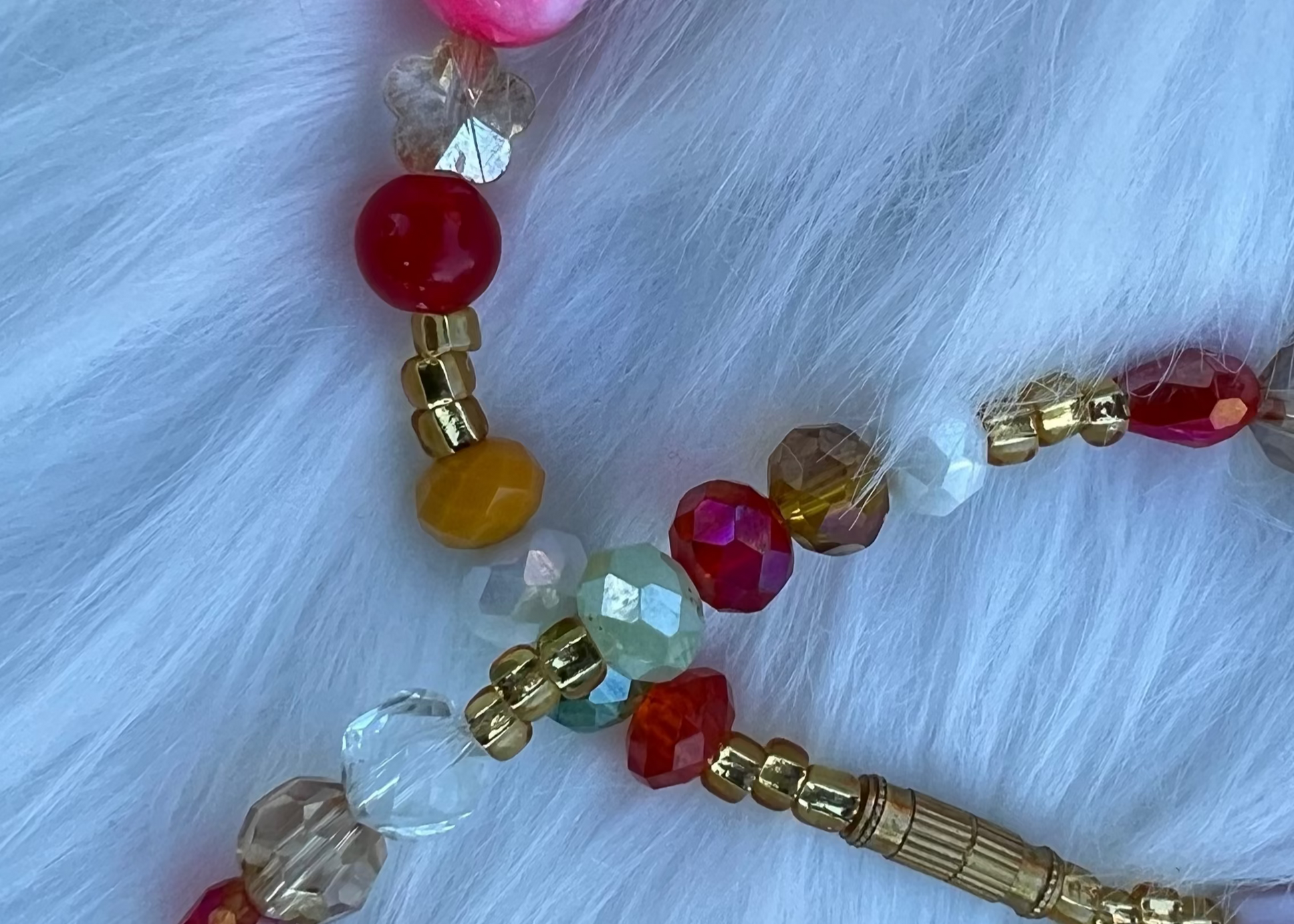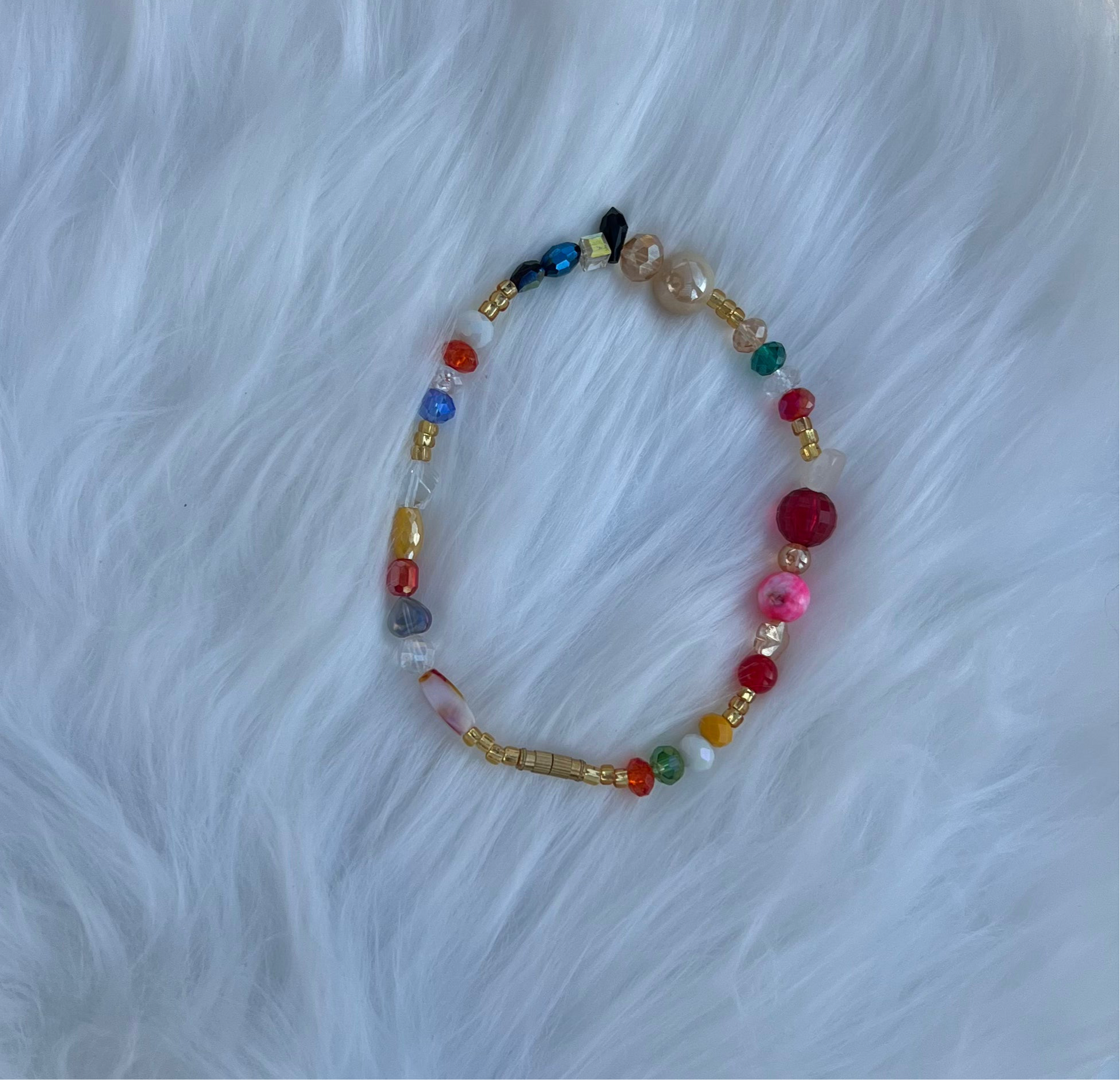 Celebrate color and creativity with the Confetti Bloom anklet — a joyful blend of multicolored faceted beads, smooth rounds, and shimmering gold spacers. From soft pinks and bold reds to emerald greens and ocean blues, each bead adds a burst of personality and charm. Secured with a classic gold-tone barrel screw clasp, this anklet is your go-to piece for fun, free-spirited style.