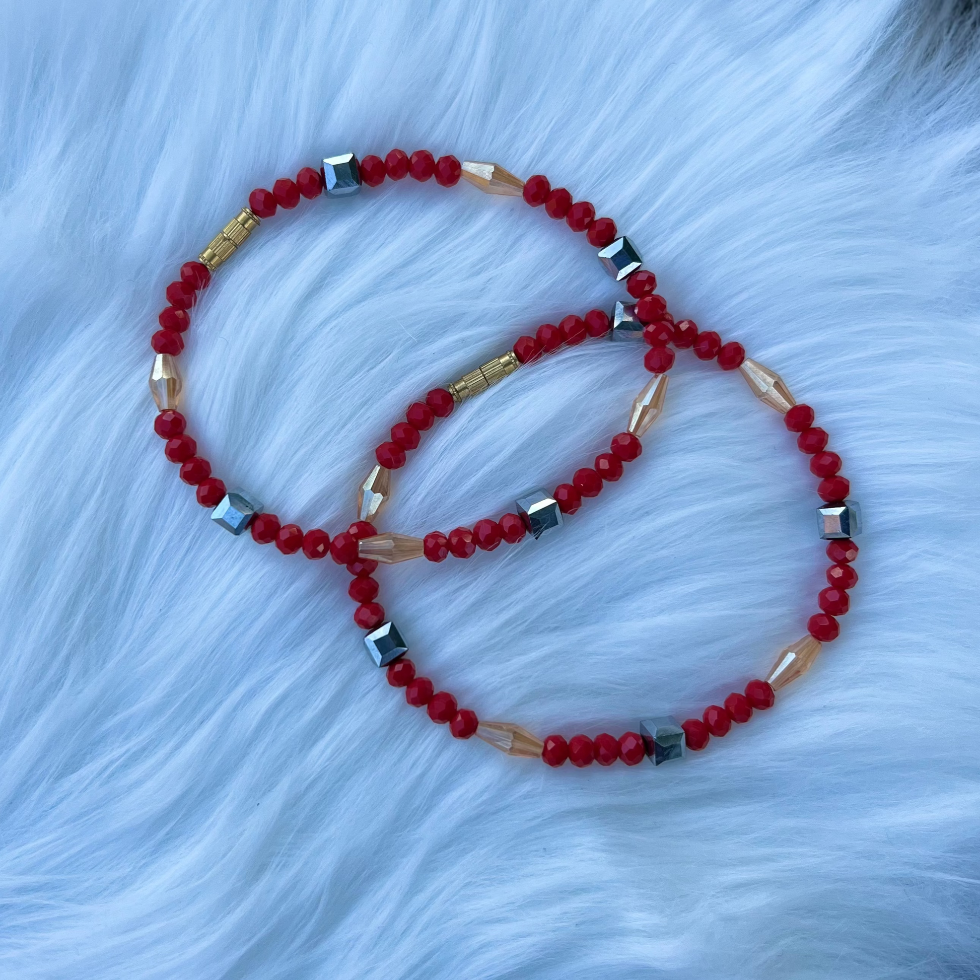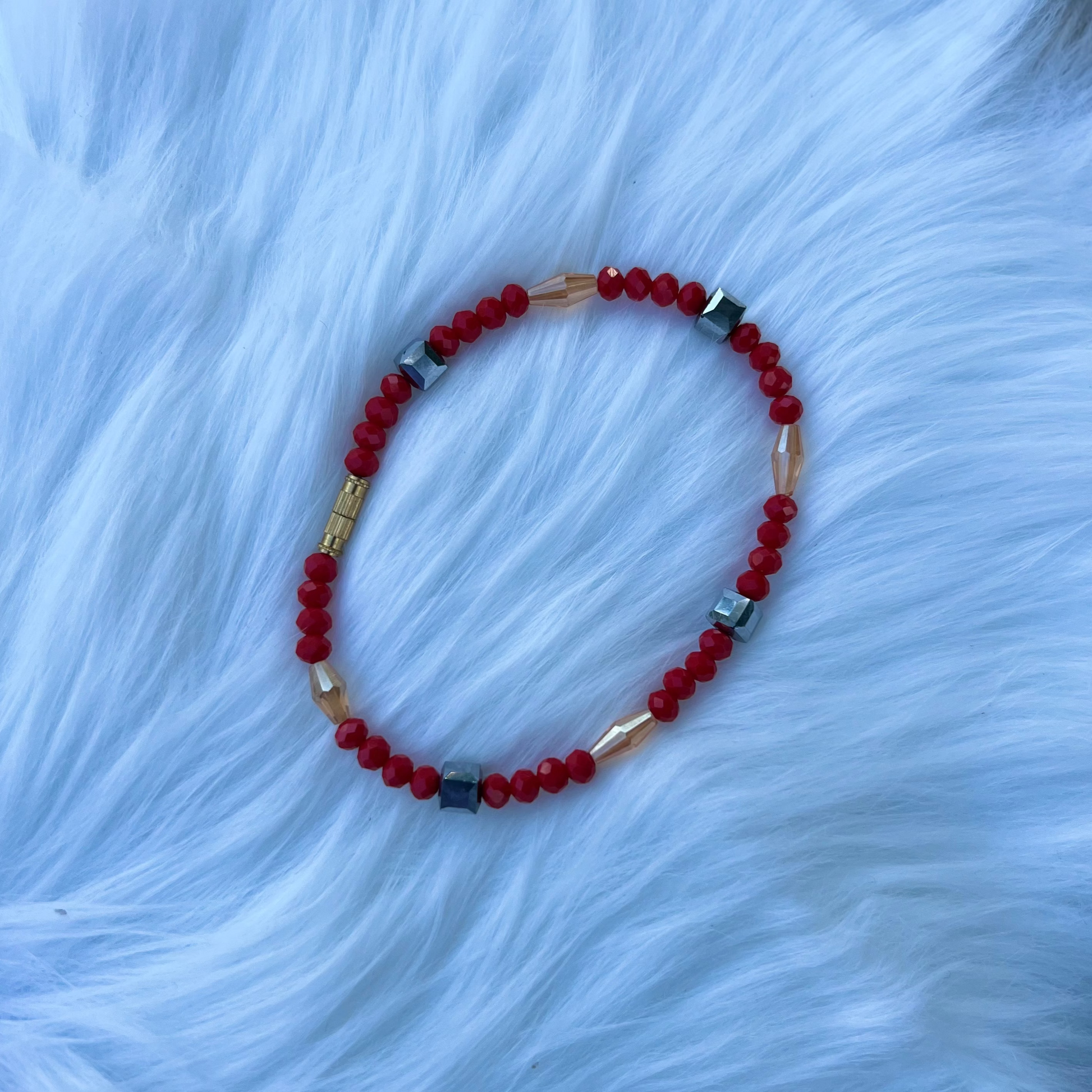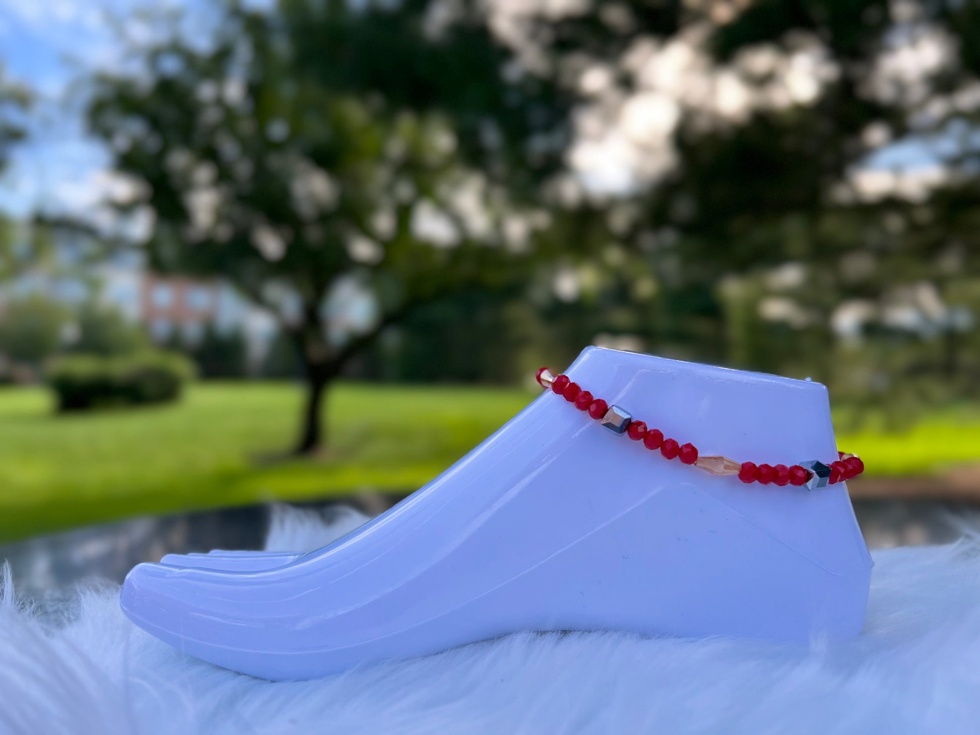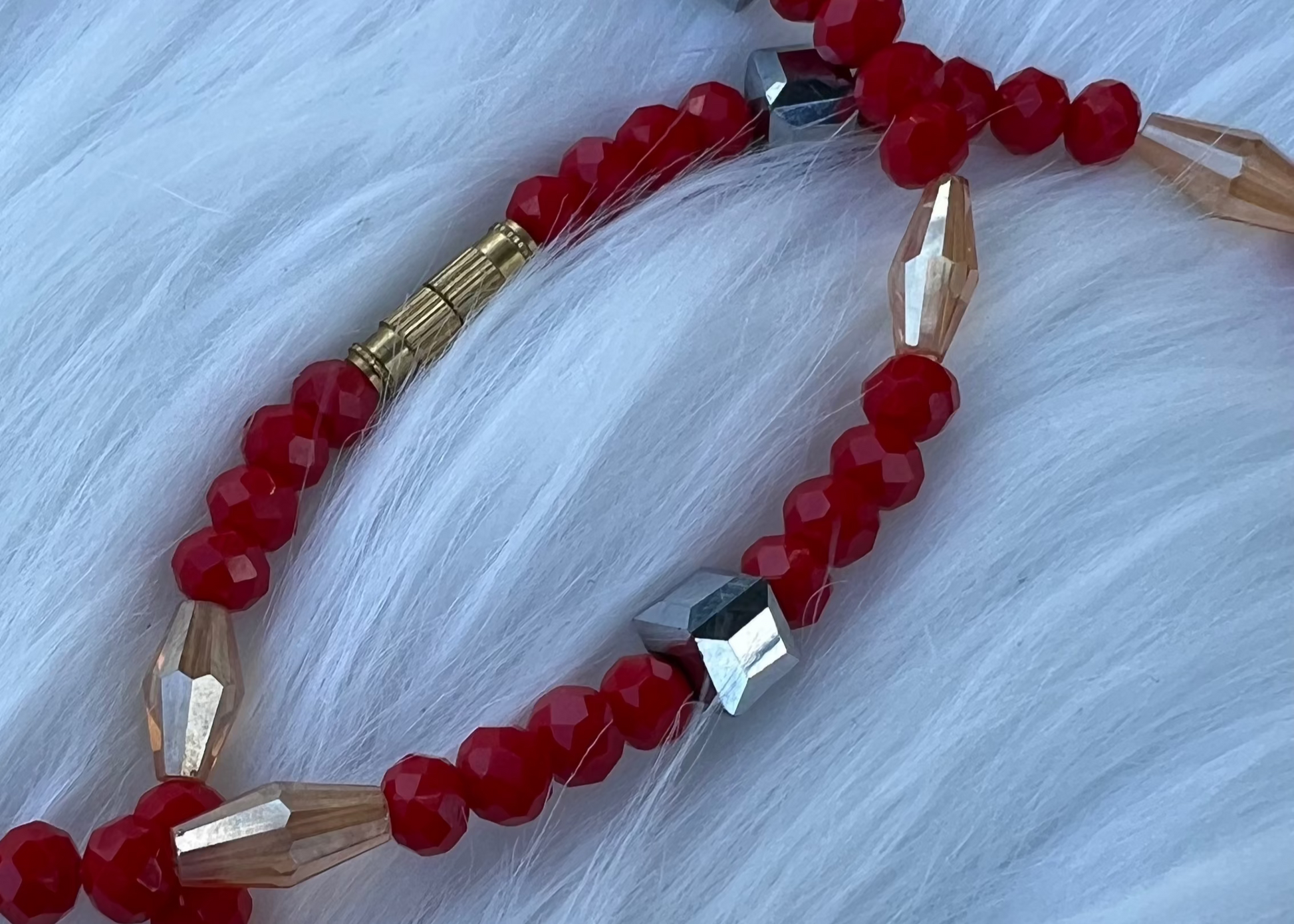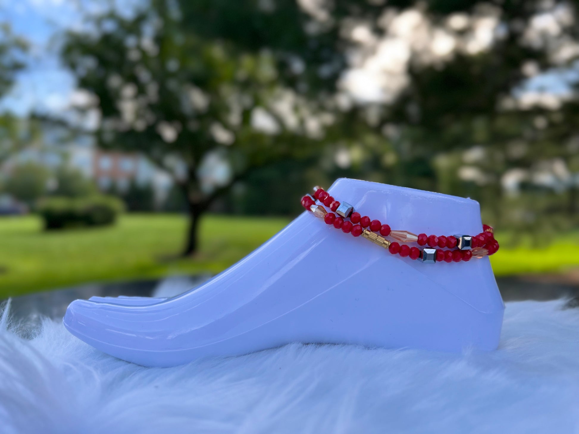 Make a fiery statement with the Crimson Ember anklet – a bold mix of radiant red faceted glass beads, sleek metallic cubes, and warm amber-toned accents. This anklet is designed to turn heads and add a touch of fierce confidence to every step. Finished with a vintage-style gold-tone barrel screw clasp for a secure, classic touch.