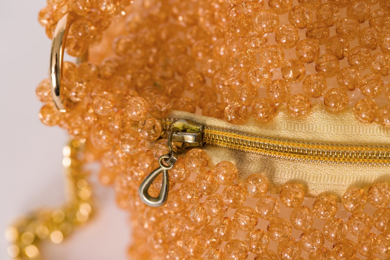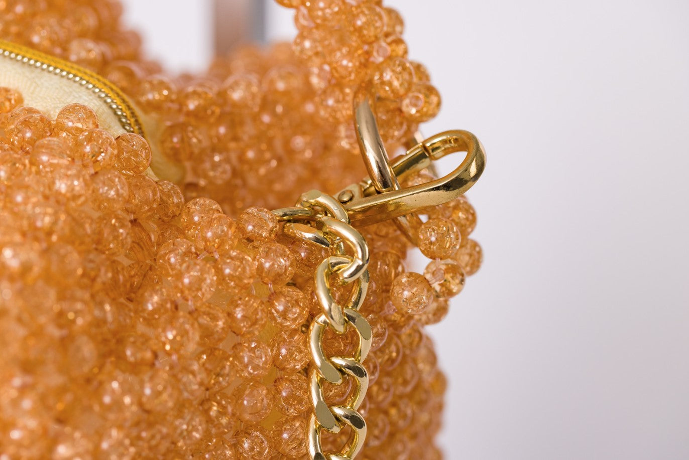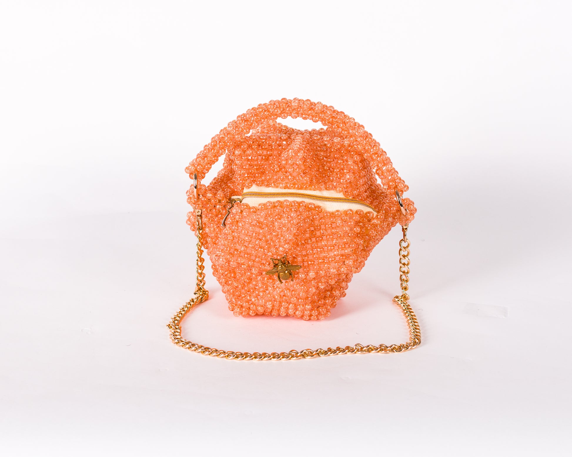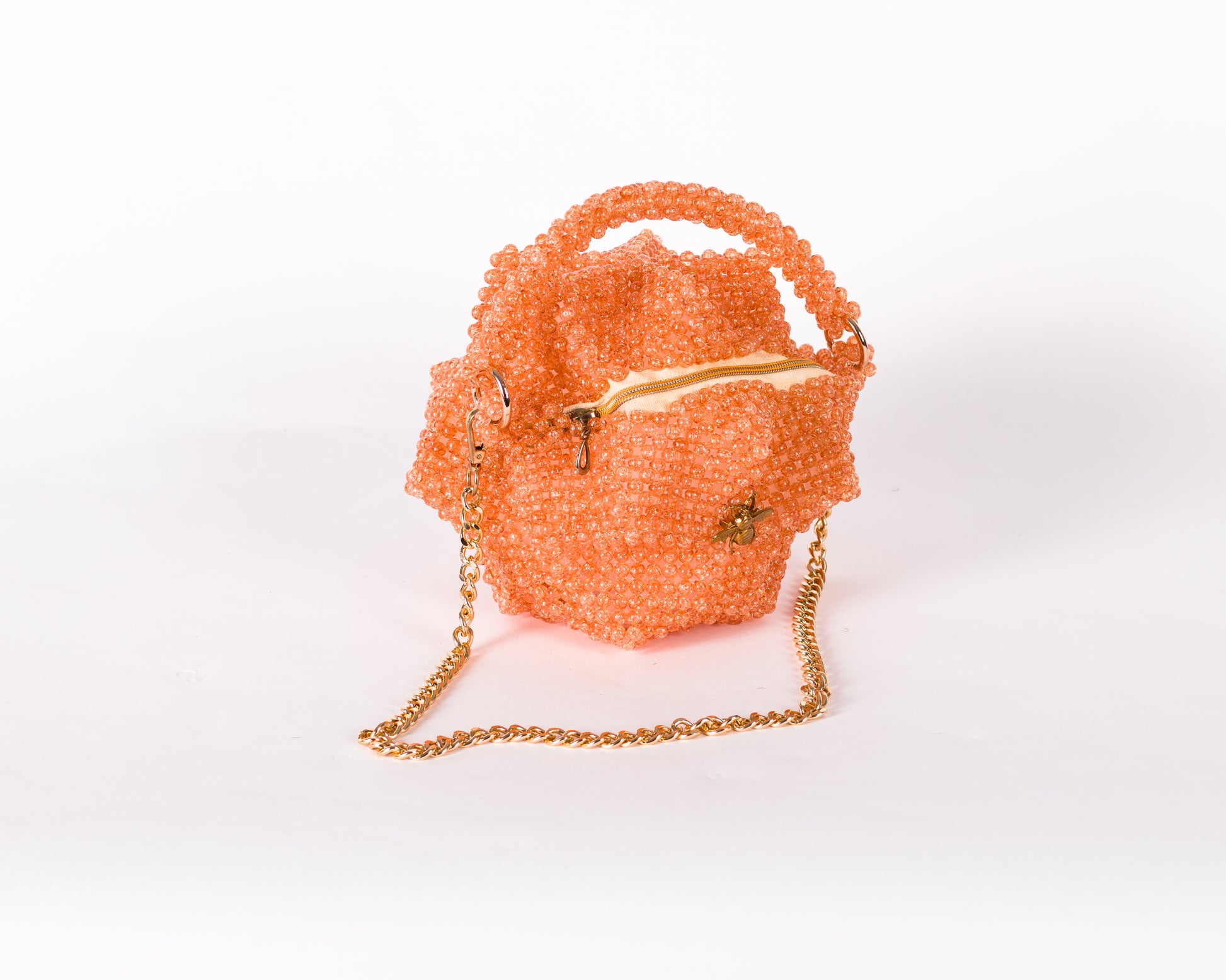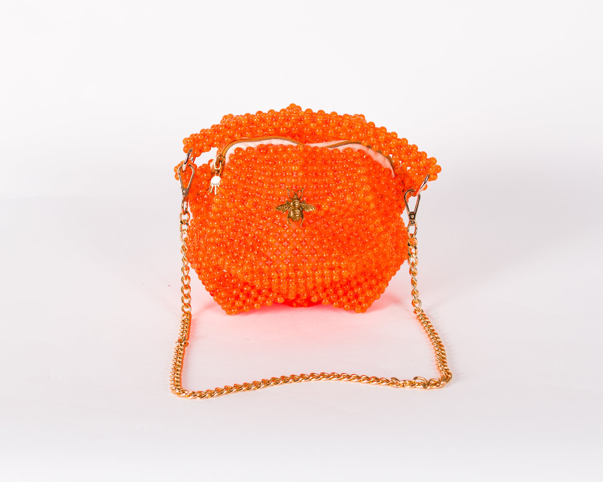 Radiant. Playful. Bold. The Dzidula bag is a joyful burst of creativity in motion. Designed with glimmering orange crackle beads in a geometric starburst silhouette, this handcrafted piece combines modern structure with vibrant Ghanaian flair. A gold-tone zipper secures your essentials, while a soft fabric lining ensures practical elegance. Whether handheld or worn with its detachable chain, Dzidula is made to spark conversation and light up your look.