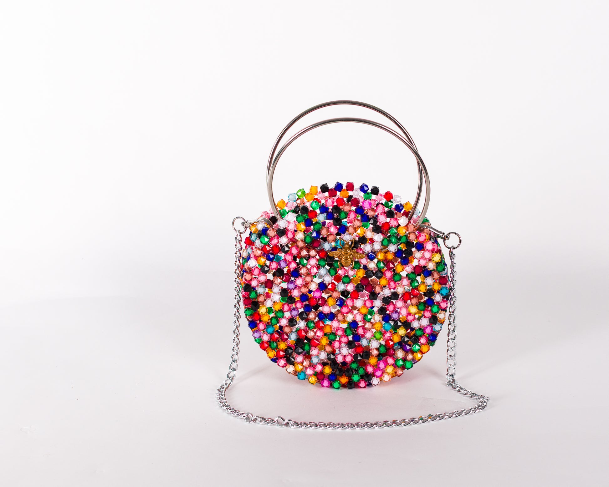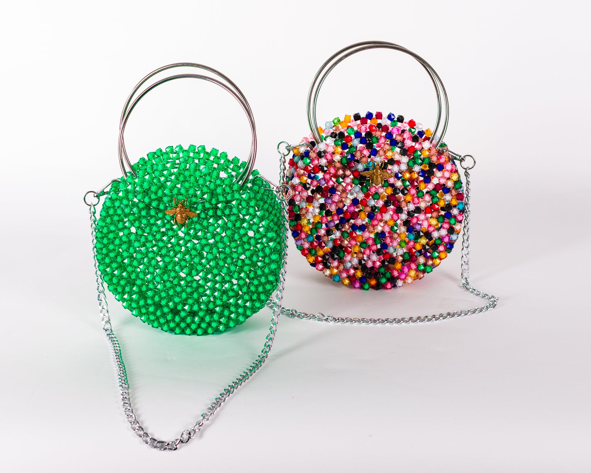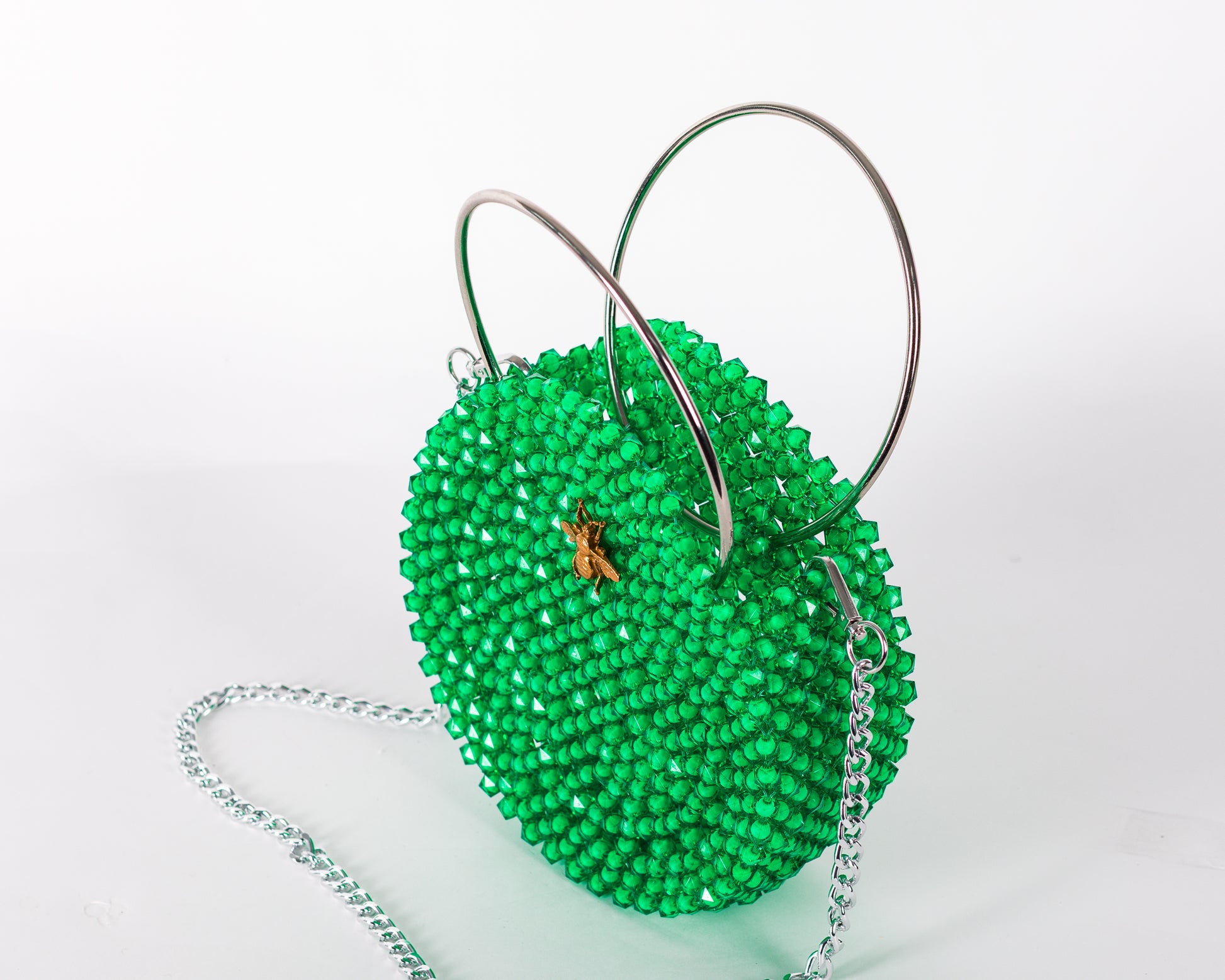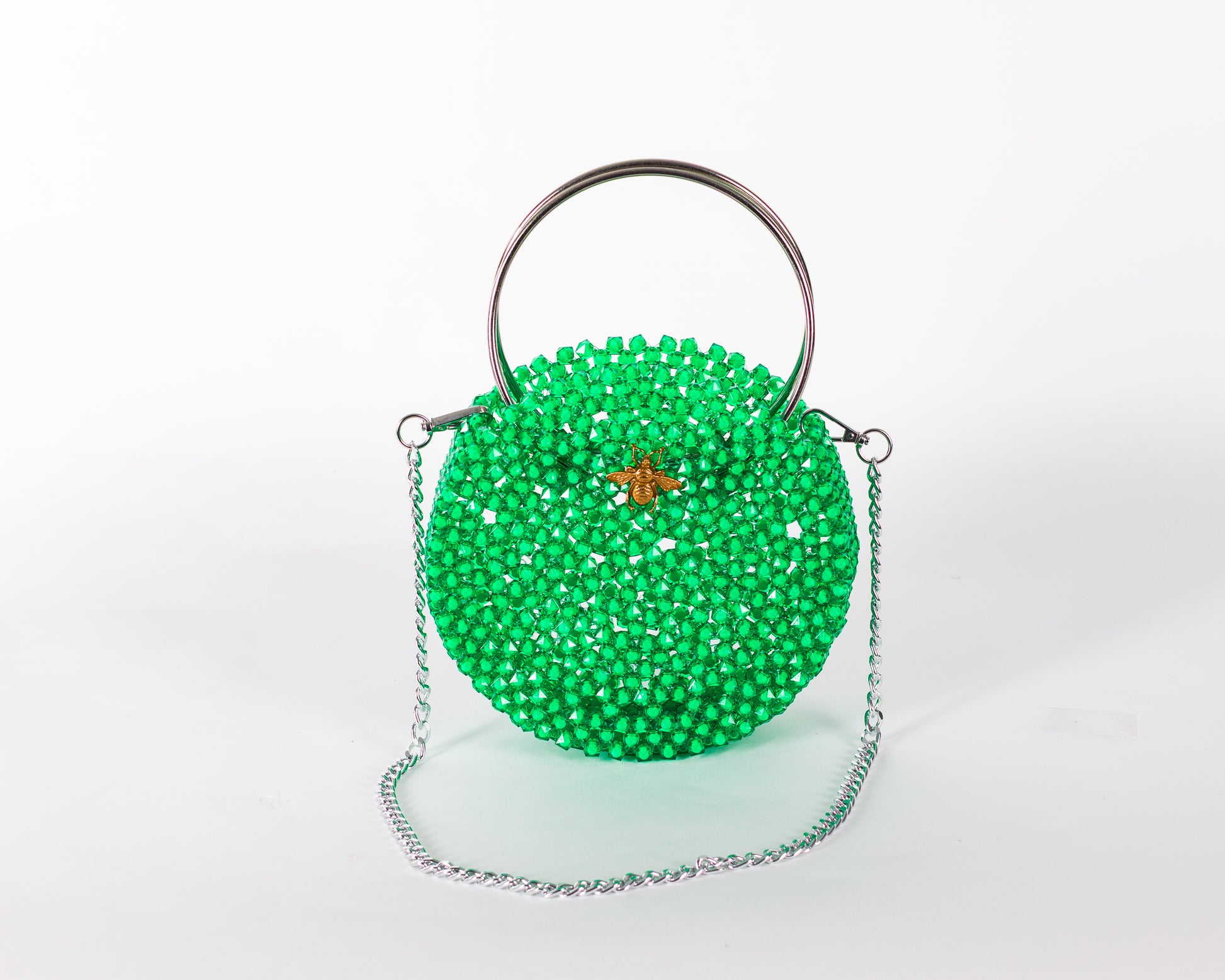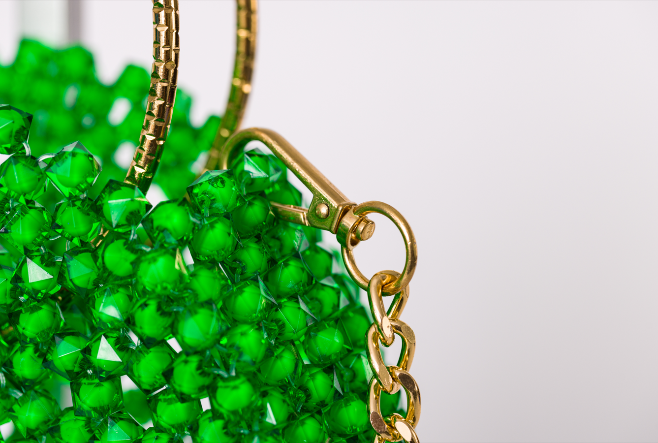 Vibrant. Vivid. Versatile. The Enyo bag is a bold circular statement designed to enchant from every angle. Hand-beaded with radiant green crystal beads, it features a sculptural silhouette framed by a textured gold circular handle and a detachable gold chain strap. Its open structure and gleaming surface give it a playful sophistication that elevates every look with a touch of joyful elegance.