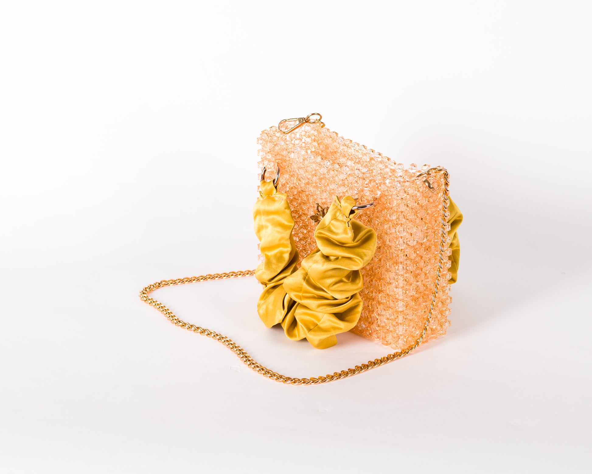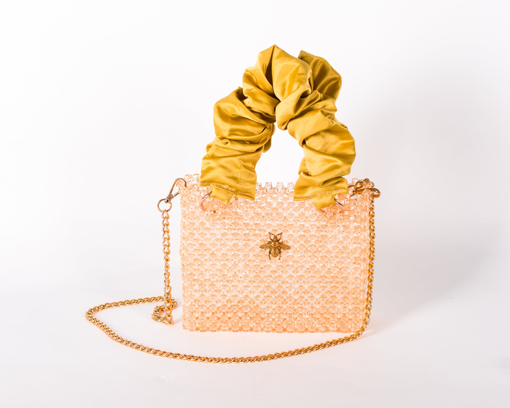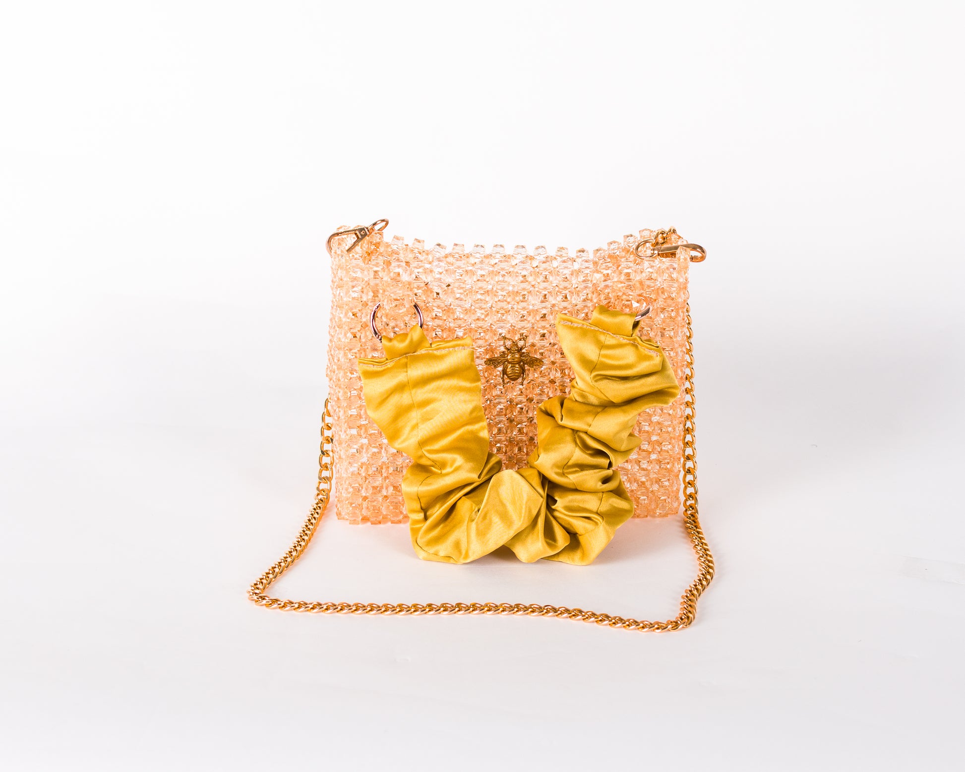 Bold. Playful. Unapologetic. The Nkyinkyim bag celebrates motion through design — a radiant blend of hand-beaded golden crystals, finished with a satin ruched handle in mustard yellow. This variant skips the acrylic base, allowing its full beaded silhouette to command the spotlight. A signature gold bee emblem anchors the bag in Beaded Bee’s identity — a fusion of elegance, energy, and Ghanaian spirit.