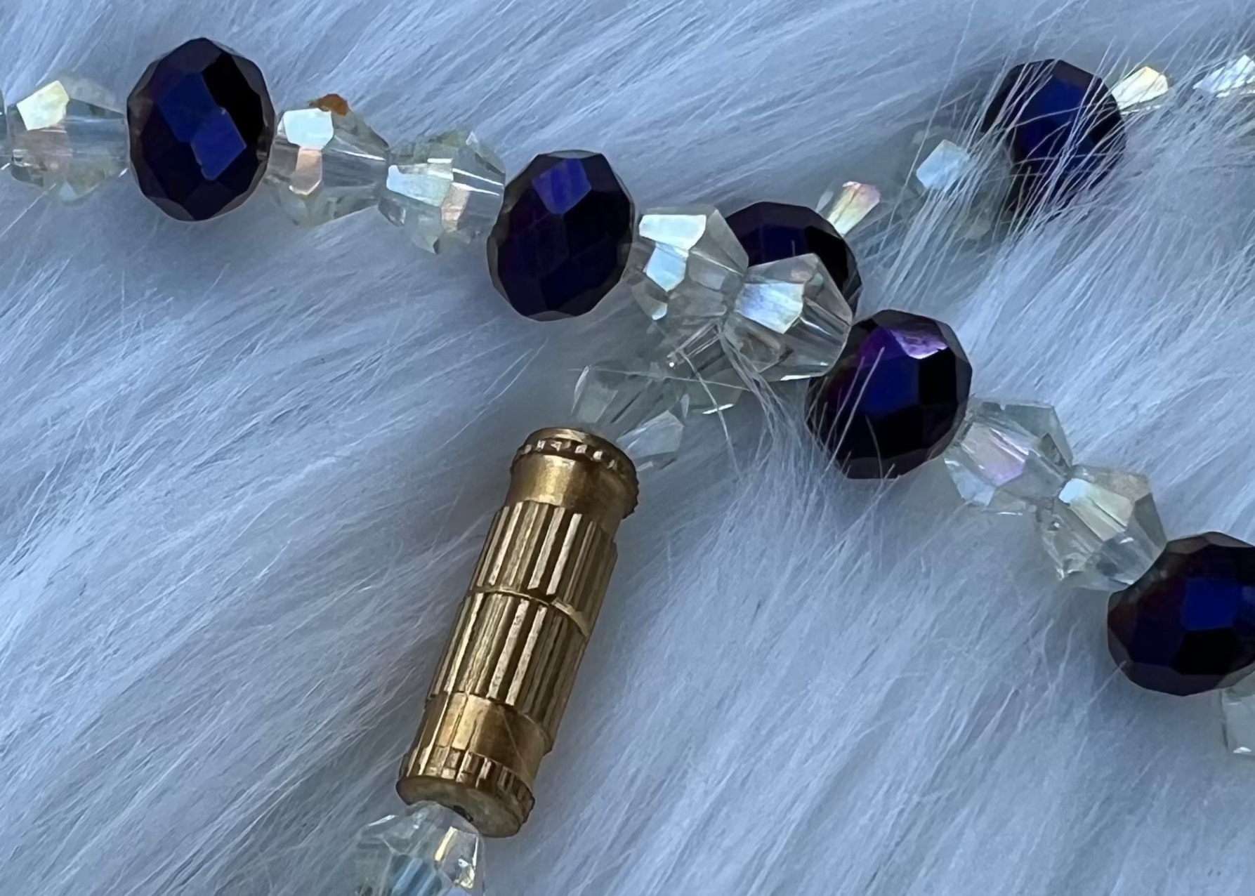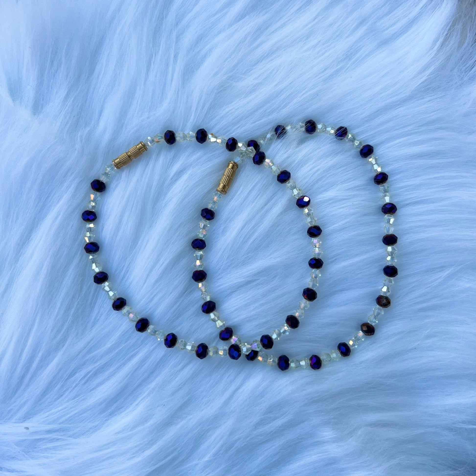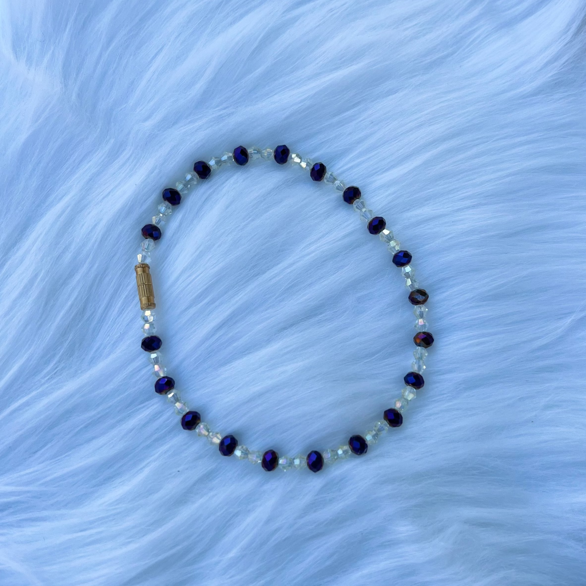 Step into the spotlight with the Twilight Aurora anklet – a captivating blend of deep iridescent purple glass beads and shimmering AB-coated crystal accents. Finished with a vintage-inspired gold-tone barrel screw clasp, this anklet adds the perfect touch of sparkle to your step, whether you’re barefoot on the beach or dressing up for a night out.